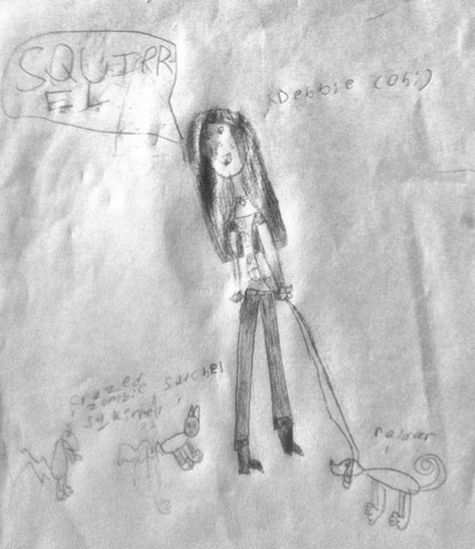 This is something Amanda drew when I told her her kitty cat looked more like a crazed squirrel. Naturally, this called for her to insert Debbie Ohi into the drawing.